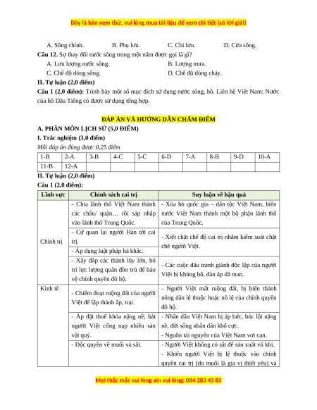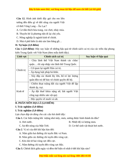 Câu 1 (2,0 điểm): Hãy suy luận về những hậu quả từ chính sách cai trị của các triều đại phong