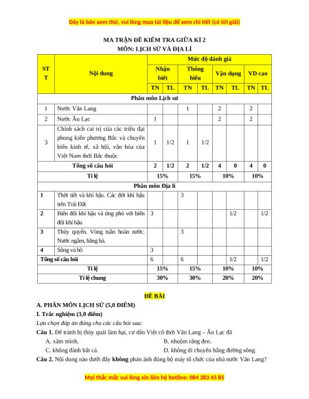 MÔN: LỊCH SỬ VÀ ĐỊA LÍ Mức độ đánh giá ST Nhận Thông Nội dung Vận dụng VD cao T biết hiểu TN TL TN TL TN TL TN TL Phân môn Lịch sử 1 Nước Văn Lang 1 2 2 2 Nước Âu Lạc 1 2 2
