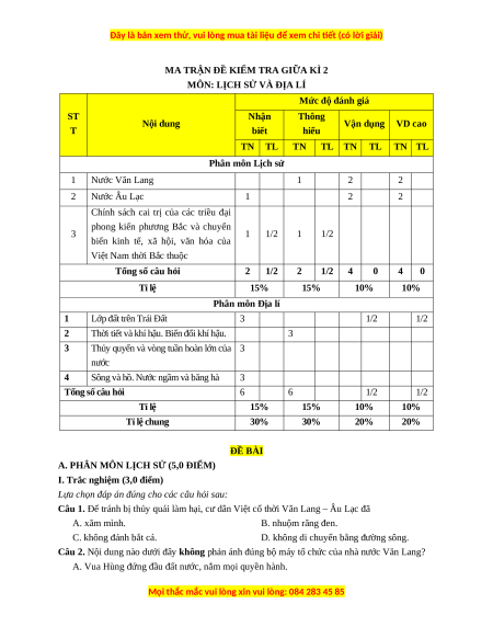 MÔN: LỊCH SỬ VÀ ĐỊA LÍ Mức độ đánh giá ST Nhận Thông Nội dung Vận dụng VD cao T biết hiểu TN TL TN TL TN TL TN TL Phân môn Lịch sử 1 Nước Văn Lang 1 2 2 2 Nước Âu Lạc 1 2 2
