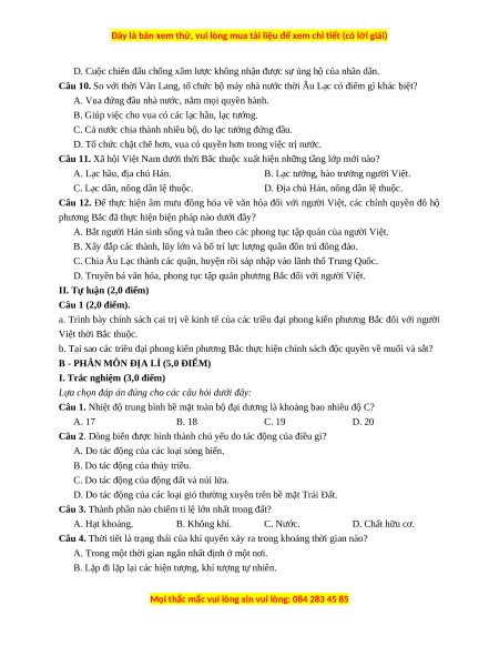 Câu 1. Để tránh bị thủy quái làm hại, cư dân Việt cổ thời Văn Lang – Âu Lạc đã A. xăm mình. B. nhuộm răng đen. C. không đánh bắt cá.