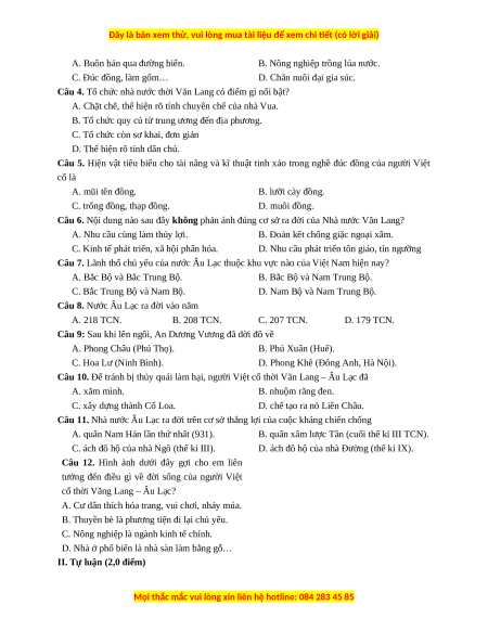 Câu 8. Nước Âu Lạc ra đời vào năm A. 218 TCN. B. 208 TCN. C. 207 TCN. D. 179 TCN.