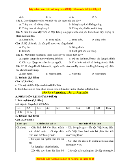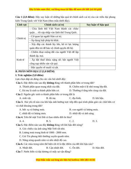 Câu 1 (2,0 điểm): Hãy suy luận về những hậu quả từ chính sách cai trị của các triều đại phong