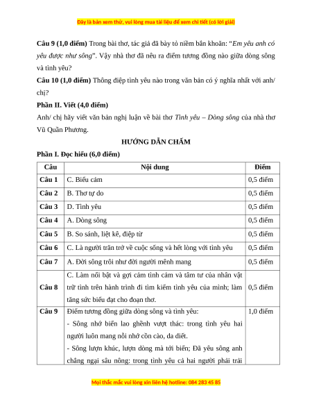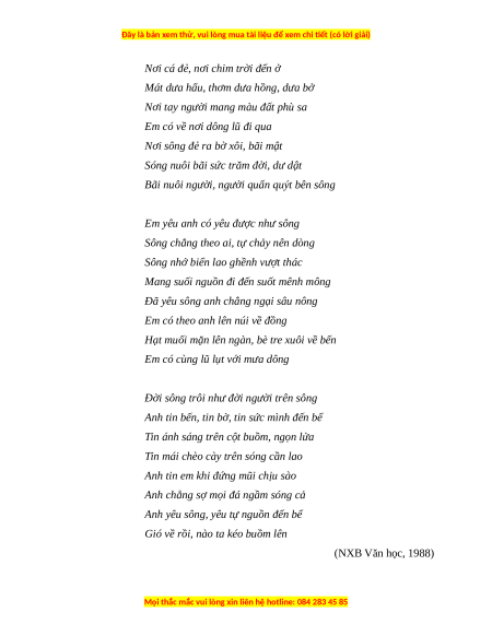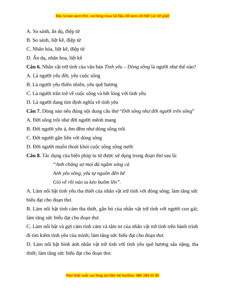 Câu 2. Văn bản Tình yêu – Dòng sông được viết theo thể thơ nào? A. Thơ bảy chữ B. Thơ tự do C. Thơ lục bát D. Thơ tám chữ