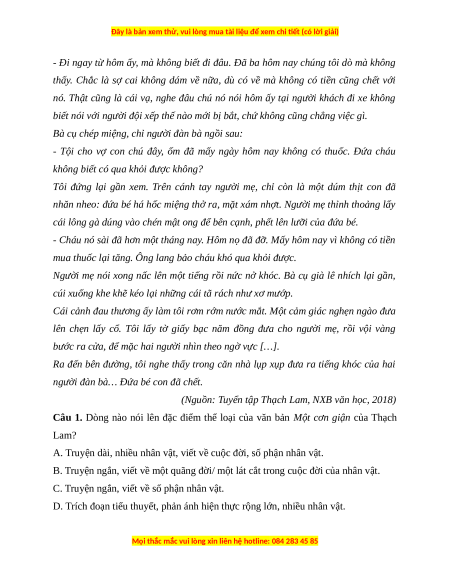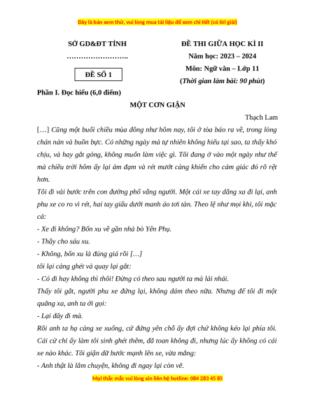 Phần I. Đọc hiểu (6,0 điểm) MỘT CƠN GIẬN Thạch Lam