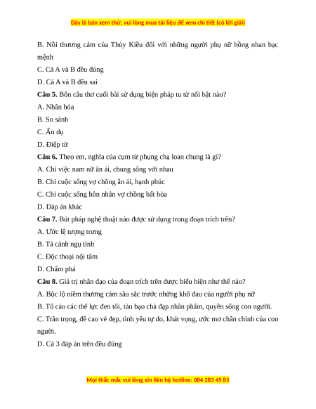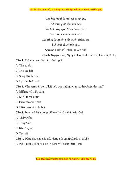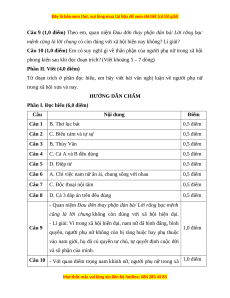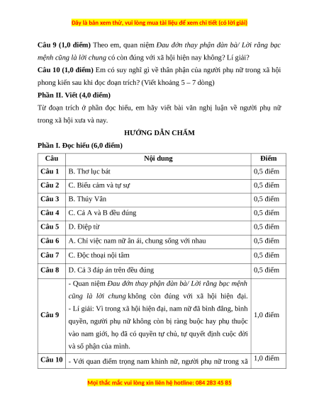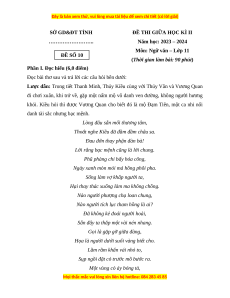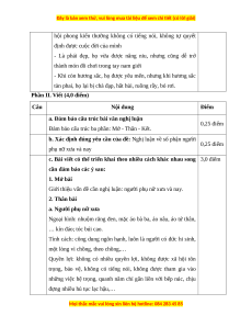 Phần I. Đọc hiểu (6,0 điểm) Câu Nội dung Điểm Câu 1 B. Thơ lục bát 0,5 điểm Câu 2 C. Biểu cảm và tự sự 0,5 điểm Câu 3 B. Thúy Vân 0,5 điểm Câu 4 C. Cả A và B đều đúng 0,5 điểm Câu 5 D. Điệp từ 0,5 điểm Câu 6