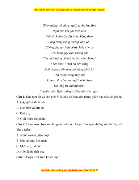 Câu 2. Dòng nào nhận xét đúng về tính cách Hoạn Thư qua những lời đối đáp với Thúy Kiều? A. Khôn ngoan, giảo hoạt B. Nhu nhược, hèn nhát C. Mưu mô, cơ hội D. Hiền lành, thật thà
