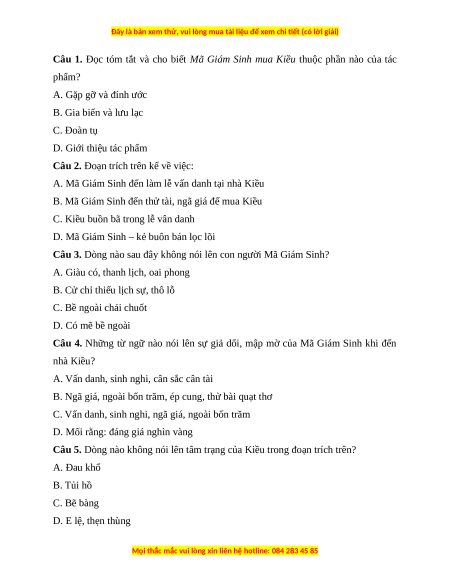 Câu 5. Dòng nào không nói lên tâm trạng của Kiều trong đoạn trích trên? A. Đau khổ B. Tủi hồ C. Bẽ bàng D. E lệ, thẹn thùng