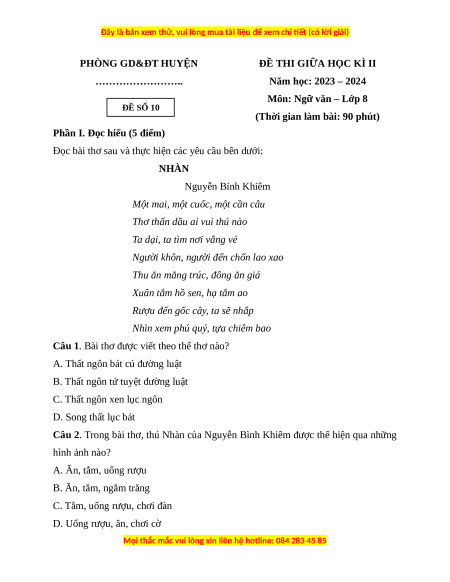 Môn: Ngữ văn – Lớp 8 ĐỀ SỐ 10