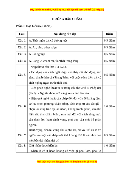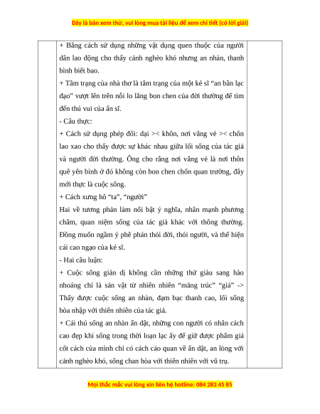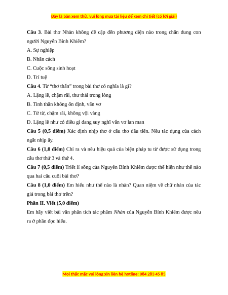 Câu 8 (1,0 điểm) Em hiểu như thế nào là nhàn? Quan niệm về chữ nhàn của tác giả trong bài thơ trên?
