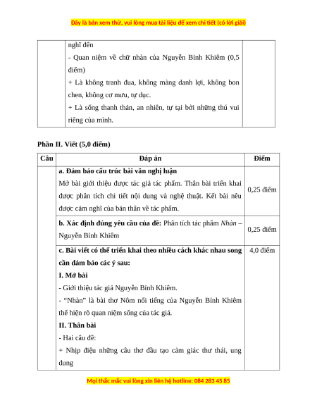 b. Xác định đúng yêu cầu của đề: Phân tích tác phẩm Nhàn – 0,25 điểm Nguyễn Bỉnh Khiêm