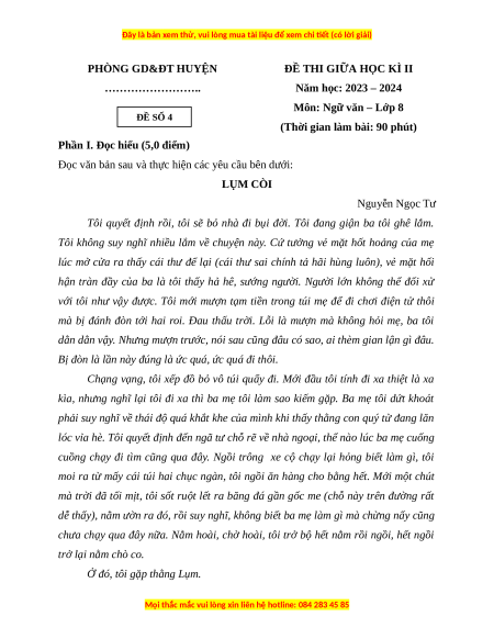 Môn: Ngữ văn – Lớp 8 ĐỀ SỐ 4