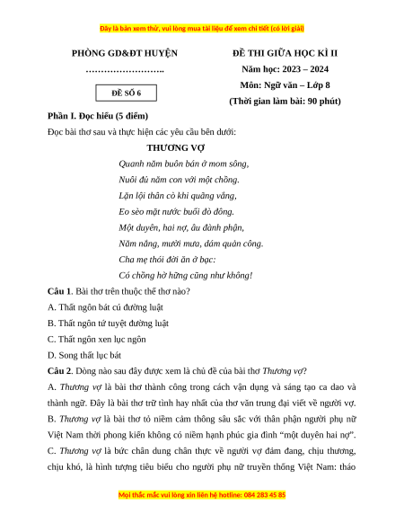 Môn: Ngữ văn – Lớp 8 ĐỀ SỐ 6