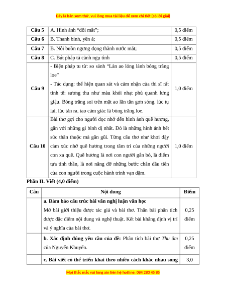 - Tác dụng: thể hiện quan sát và cảm nhận của thi sĩ rất Câu 9 1,0 điểm