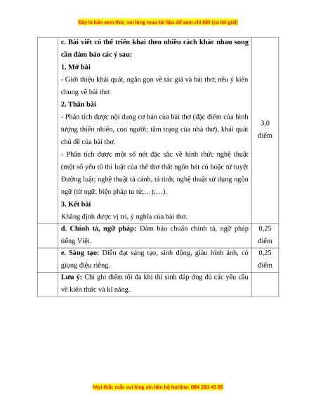 A. Thất ngôn bát cú đường luật 0,5 điểm Câu 2 C. Biểu cảm, miêu tả 0,5 điểm Câu 3 D. Cả ba đáp án trên 0,5 điểm Câu 4