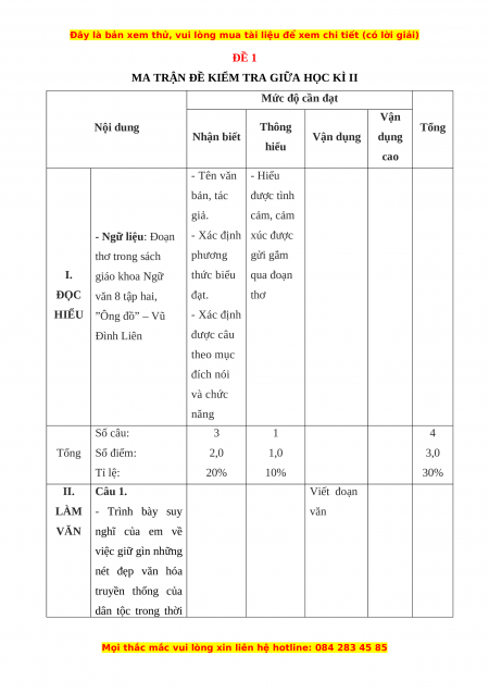 HIỂU ”Ông đồ” – Vũ - Xác định Đình Liên được câu theo mục đích nói và chức năng Số câu: 3 1 4 Tổng Số điểm: 2,0 1,0 3,0 Tỉ lệ: 20% 10% 30% II. Câu 1. Viết đoạn LÀM - Trình bày suy văn VĂN nghĩ của em về việc giữ gìn những nét đẹp văn hóa truyền thống của dân tộc trong thời