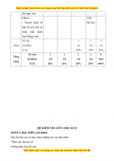 đại ngày nay Câu 2. Viết - Thuyết minh về bài văn một di tích lịch sử hoặc một danh lam thắng cảnh. Số câu: 1 1 2 Tổng Số điểm: 2,0 5,0 7,0 Tỉ lệ: 20% 50% 70% Số câu: 3 1 1 1 6 Tổng Số điểm: 2,0 1,0 2,0 5,0 10,0 cộng Tỉ lệ: 20% 10% 20% 50% 100%