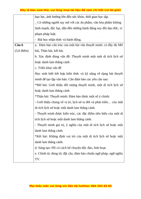 Câu 6 (5,0 điểm): Thuyết minh về một di tích lịch sử hoặc một danh lam thắng cảnh ở quê hương em. HƯỚNG DẪN CHẤM