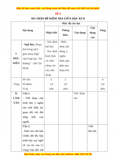 HIỂU đường” – Hồ Chí năng của gắm qua Minh câu trần đoạn thơ thuật Số câu: 2 2 4 Tổng Số điểm: 1,0 2,0 3,0 Tỉ lệ: 10% 20% 30% II. Câu 1. Viết đoạn LÀM - Viết đoạn văn văn VĂN trình bày ý nghĩa của tinh thần lạc quan đối với đời sống mỗi con người. Câu 2. Viết - Dựa vào văn bản bài văn Chiếu dời đô, hãy trình bày suy nghĩ về vai trò của Lí Công Uẩn đối với