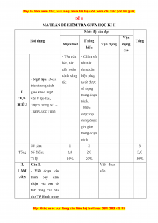 HIỂU ”Hịch tướng sĩ” – - Hiểu Trần Quốc Tuấn được nội dung được gửi gắm trong đoạn trích Số câu: 1 2 3 Tổng Số điểm: 1,0 2,0 3,0 Tỉ lệ: 10% 20% 30% II. Câu 1. Viết đoạn LÀM - Viết đoạn văn văn VĂN trình bày cảm nhận của em về tâm trạng của nhà thơ Tế Hanh trong