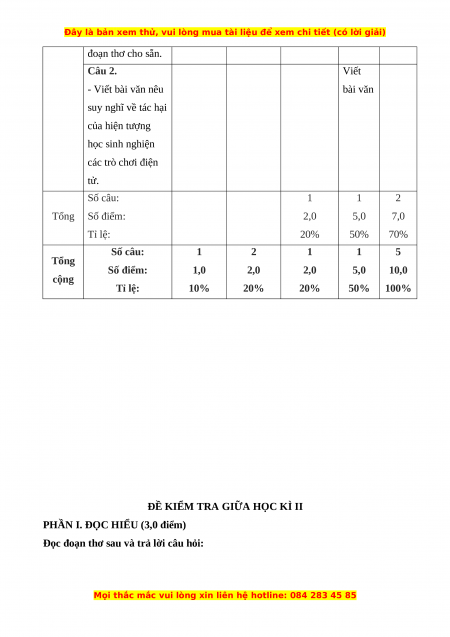 đoạn thơ cho sẵn. Câu 2. Viết - Viết bài văn nêu bài văn suy nghĩ về tác hại của hiện tượng học sinh nghiện các trò chơi điện tử. Số câu: 1 1 2 Tổng Số điểm: 2,0 5,0 7,0 Tỉ lệ: 20% 50% 70% Số câu: 1 2 1 1 5 Tổng Số điểm: 1,0 2,0 2,0 5,0 10,0 cộng Tỉ lệ: 10% 20% 20% 50% 100%