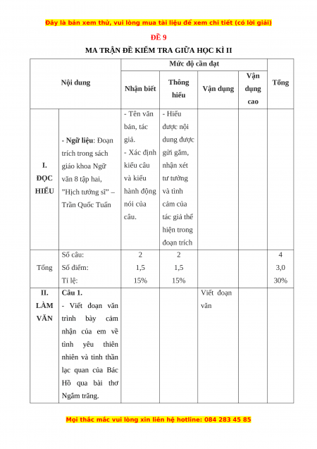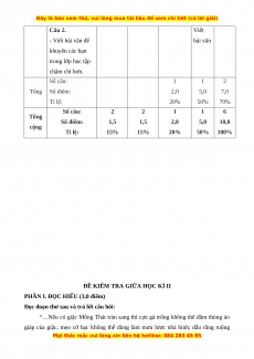 HIỂU ”Hịch tướng sĩ” – hành động và tình Trần Quốc Tuấn nói của cảm của câu. tác giả thể hiện trong đoạn trích Số câu: 2 2 4 Tổng Số điểm: 1,5 1,5 3,0 Tỉ lệ: 15% 15% 30% II. Câu 1. Viết đoạn LÀM - Viết đoạn văn văn VĂN trình bày cảm nhận của em về tình yêu thiên nhiên và tinh thần lạc quan của Bác Hồ qua bài thơ Ngắm trăng.