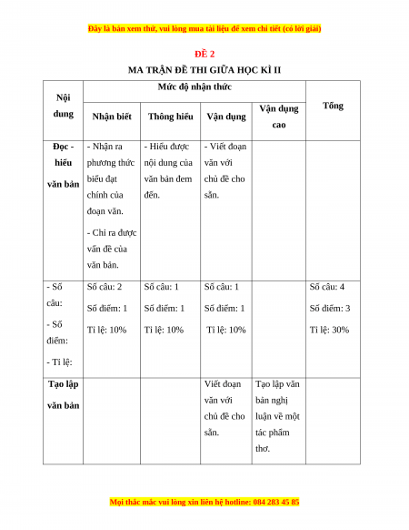 văn bản đem chủ đề cho văn bản chính của đến. sẵn. đoạn văn. - Chỉ ra được vấn đề của văn bản. - Số Số câu: 2 Số câu: 1 Số câu: 1 Số câu: 4 câu: Số điểm: 1 Số điểm: 1 Số điểm: 1 Số điểm: 3 - Số Tỉ lệ: 10% Tỉ lệ: 10% Tỉ lệ: 10% Tỉ lệ: 30% điểm: - Tỉ lệ: Tạo lập Viết đoạn Tạo lập văn văn với bản nghị văn bản