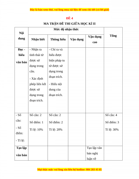 phép liên kết - Hiểu nội được sử dung của dụng trong đoạn trích. đoạn trích. - Số Số câu: 2 Số câu: 2 Số câu: 4 câu: Số điểm: 1 Số điểm: 2 Số điểm: 3 - Số Tỉ lệ: 10% Tỉ lệ: 20% Tỉ lệ: 30% điểm: - Tỉ lệ: Tạo lập Tạo lập văn bản nghị văn bản luận về