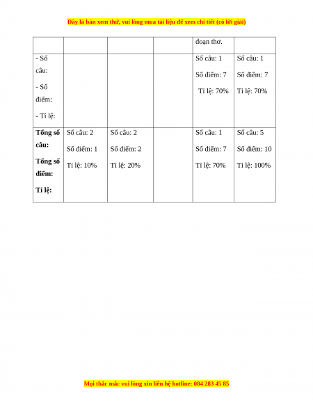 đoạn thơ. - Số Số câu: 1 Số câu: 1 câu: Số điểm: 7 Số điểm: 7 - Số Tỉ lệ: 70% Tỉ lệ: 70% điểm: - Tỉ lệ: