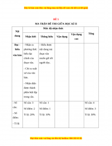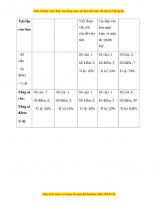 phương thức nội dung mà biểu đạt đoạn văn văn bản chính của muốn gửi tới đoạn văn. người đọc. - Chỉ ra xuất xứ của văn bản. - Nhận diện được thành phần biệt lập trong câu. - Số Số câu: 3 Số câu: 1 Số câu: 4 câu: Số điểm: 2 Số điểm: 1 Số điểm: 3 - Số Tỉ lệ: 20% Tỉ lệ: 10% Tỉ lệ: 30% điểm: - Tỉ lệ: