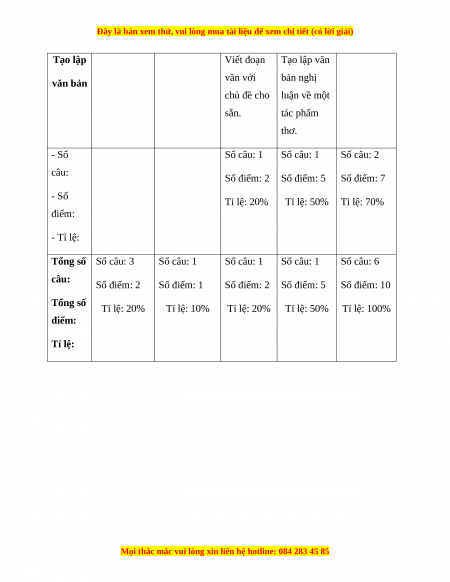 chủ đề cho luận về một sẵn. tác phẩm thơ. - Số Số câu: 1 Số câu: 1 Số câu: 2 câu: Số điểm: 2 Số điểm: 5 Số điểm: 7 - Số Tỉ lệ: 20% Tỉ lệ: 50% Tỉ lệ: 70% điểm: - Tỉ lệ: