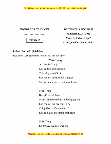 Môn: Ngữ văn – Lớp 7 ĐỀ SỐ 10