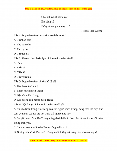 Câu 1. Đoạn thơ trên được viết theo thể thơ nào? A. Thơ bốn chữ B. Thơ năm chữ C. Thơ tự do D. Thơ lục bát