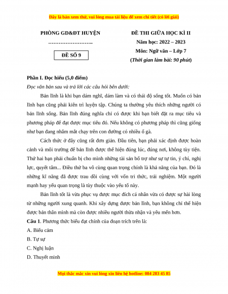 Đề thi giữa kì 2 Ngữ Văn lớp 7 Cánh diều có đáp án (Đề 9)