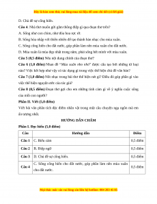 Phần I. Đọc hiểu (5,0 điểm) Câu Hướng dẫn Điểm Câu 1 C. Biểu cảm 0,5 điểm Câu 2 B. Điệp ngữ 0,5 điểm