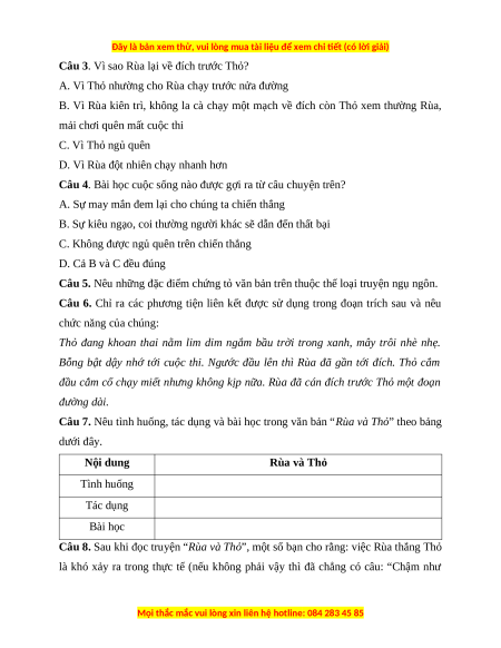 Câu 7. Nêu tình huống, tác dụng và bài học trong văn bản “Rùa và Thỏ” theo bảng dưới đây. Nội dung Rùa và Thỏ Tình huống Tác dụng Bài học