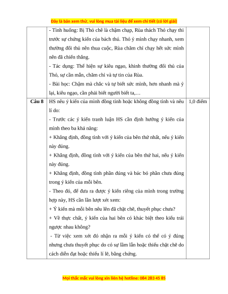 Câu 7 HS nêu được tình huống, tác dụng và bài học của truyện “Rùa 1,0 điểm và Thỏ”: