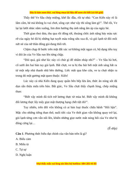 Câu 1. Phương thức biểu đạt chính của văn bản trên là gì? A. Biểu cảm B. Miêu tả C. Tự sự D. Nghị luận