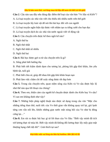 Câu 2. Câu nào sau đây nêu đúng đặc điểm thể loại của văn bản “Ve Sầu và Kiến”?