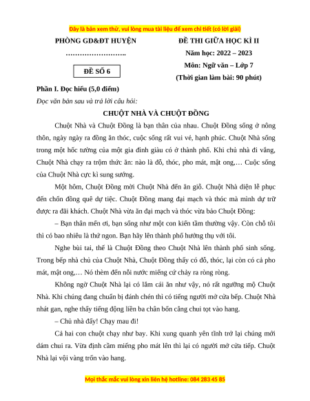 Môn: Ngữ văn – Lớp 7 ĐỀ SỐ 6