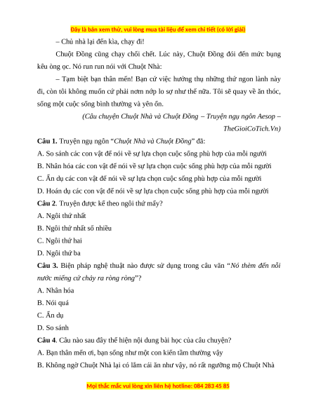 Câu 1. Truyện ngụ ngôn “Chuột Nhà và Chuột Đồng” đã: