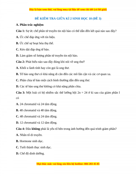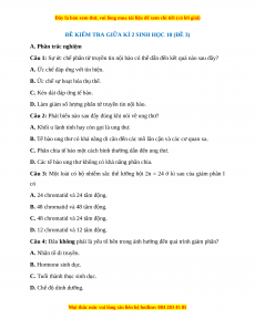 ĐỀ KIỂM TRA GIỮA KÌ 2 SINH HỌC 10 (ĐỀ 3)
