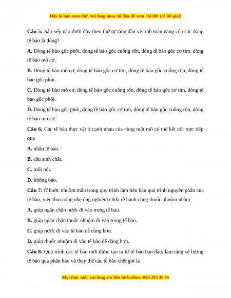 Câu 5: Sắp xếp nào dưới đây theo thứ tự tăng dần về tính toàn năng của các dòng tế bào là đúng?