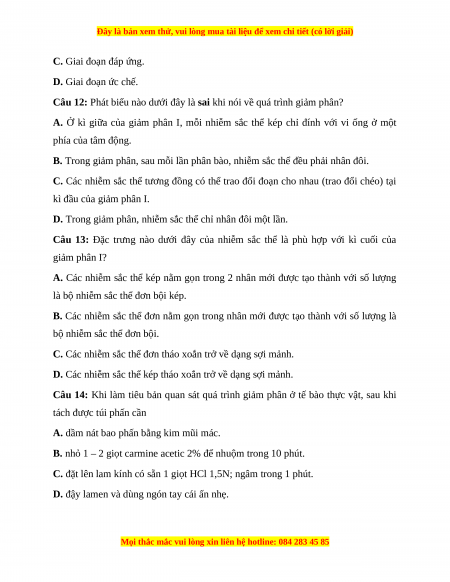 Câu 12: Phát biểu nào dưới đây là sai khi nói về quá trình giảm phân?