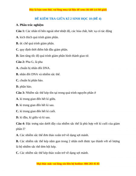 ĐỀ KIỂM TRA GIỮA KÌ 2 SINH HỌC 10 (ĐỀ 4)
