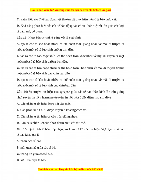 Câu 12: Phát biểu nào sau đây không đúng khi nói về sự phản biệt hóa?