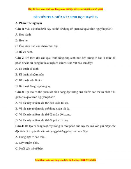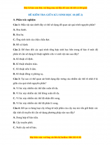 ĐỀ KIỂM TRA GIỮA KÌ 2 SINH HỌC 10 (ĐỀ 2)