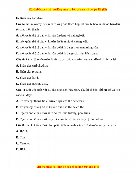 Câu 8: Sau khi tách được bao phấn từ hoa hành, cần cố định mẫu trong dung dịch A. H2SO4. B. Cồn. C. Carnoy. D. HCl.