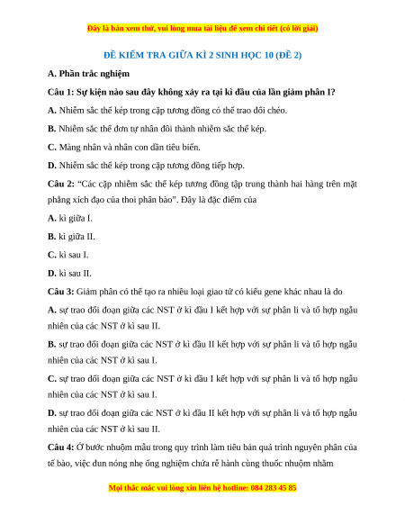 ĐỀ KIỂM TRA GIỮA KÌ 2 SINH HỌC 10 (ĐỀ 2)