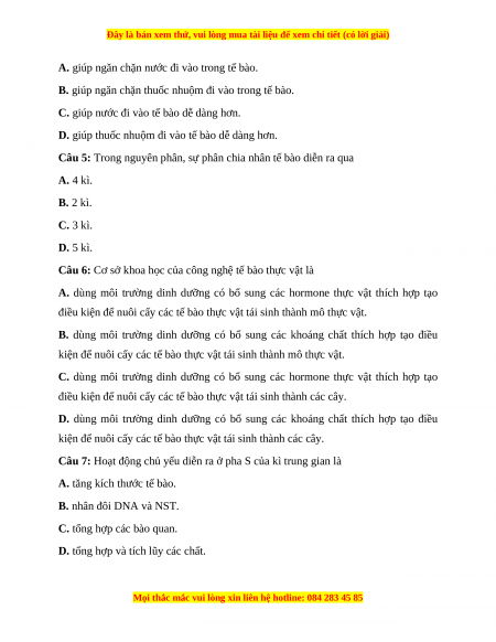 Câu 5: Trong nguyên phân, sự phân chia nhân tế bào diễn ra qua A. 4 kì. B. 2 kì. C. 3 kì. D. 5 kì.