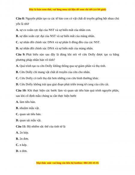 Câu 8: Nguyên phân tạo ra các tế bào con có vật chất di truyền giống hệt nhau chủ yếu là nhờ